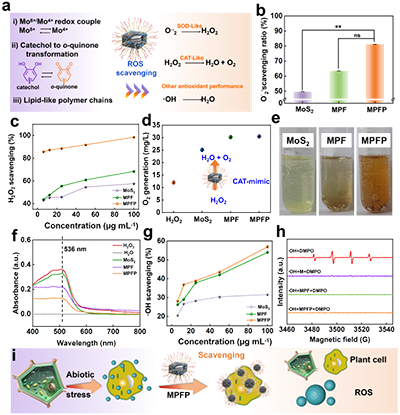 该研究构建的核心体系为负载MPFP纳米酶的可溶解透明质酸微针阵列(MPFP-HAMNs)。其中,MPFP由Fe2+掺杂聚多巴胺与两性离子聚合物修饰的MoS2纳米片组成,兼具光热转化、离子释放与仿生酶催化等多重功能;透明质酸微针则作为可溶解载体,负责穿透植物叶片角质层并完成原位递送。该微针阵列能够贴合叶片表面并在数秒内完成穿透和溶解,将功能纳米酶有效递送至叶肉组织,建立稳定高效的植物-材料生物界面。从材料设计上看,这一体系体现出鲜明的多组分协同特征。MoS2提供了纳米酶活性基础,聚多巴胺赋予体系优异的近红外响应能力,Fe2+作为关键营养元素参与叶绿素生物合成,而两性离子聚合物则有助于提升体系分散性、稳定性及界面相容性。多组分集成后,材料不仅实现了温和光热响应下的按需释放,同时还具备明显的SOD/CAT样仿酶活性,可高效清除O·-2、H2O2 和·OH等活性氧物种。