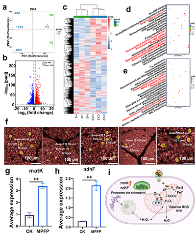 研究显示,在 808 nm 近红外光照射下,MPFP纳米酶可在约35°C的温和条件下实现受控升温和Fe2+释放,避免了过热对植物组织造成损伤。与此同时,材料的ROS清除能力有助于缓解高温引发的氧化胁迫,保护叶绿体结构与功能。也就是说,该平台并非单纯的“递送工具”,而是一个集精准输送、环境响应与生物调控于一体的功能系统。