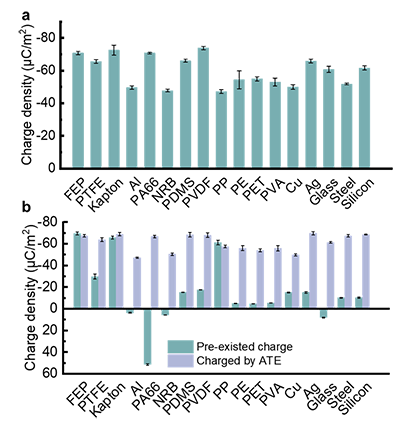 将ATE与目前常用的多种接触起电材料接触分离,利用单电极TENG测试其在这些表面产生的起电电荷。在接触前,材料表面被清洁以达到电中性状态,确保不存在预先存在的电荷。如图3a所示,接触后,所有材料的表面通过ATE产生电荷密度,范围都在-50 μC/m2至-70 μC/m2之间。并且,对于预先充电使表面存在初始电荷密度的样品,仍能获得类似的接触起电电荷密度结果,如图3b所示。这一实验结果有力地证明了使用离子液体和高粘附力基底的ATE设计理念在接触起电归一化方面带来的显著效果。