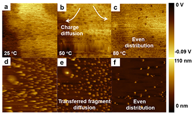 由ATE与SiO2接触分离产生的电荷带来的表面电势分布以及表面形貌可以看出,负电势主要集中在由ATE斑点覆盖的,表面起伏较高区域。随着温度的升高,ATE的流动性增加,斑点逐渐扩散,这使得电势的分布也扩展并逐渐在表面上均匀分布。至此,可以确定,在与ATE接触后所产生的电荷并非主要由电子转移所致,而是源自带电的ATE分子链片段。