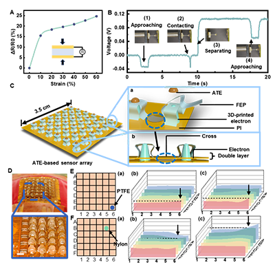 使用具有6×6个输出通道的传感阵列演示其静电追踪功能。整个器件有效面积为3.5×3.5 cm,每个传感器单元的宽度和高度均在3 mm以内,且该阵列可在弯曲状态下使用,从而使得传感阵列能够方便地集成到复杂的表面上。图4-43展示了在非接触模式下检测聚四氟乙烯(PTFE)和尼龙探针时静电跟踪信号的数据可视化。在与ATE接触前,由于PTFE探针和尼龙探针原始电荷不同,检测电极在相同高度上检测到不同的信号。接触后,在相同的高度,两种探针在不同的点位上观察到了同样的信号强度,这表明对不同探针进行跟踪时产生的相同电荷。因此,只要与传感器表面的ATE接触后,被追踪物体就会被带上标记电荷,此时传感信号强度就只与目标的位置相关。这样的传感效果可以在视觉受限且无法预先预测材料特性的情况下轻松排除无关变量的干扰。这一应用首次提出了将静电荷作为追踪目标的概念和方法,给CE的应用带来了新的突破,特别是在人机交互和智能机器人领域,这种非视觉的主动追踪有望赋予机器人更接近人类触觉的感官。