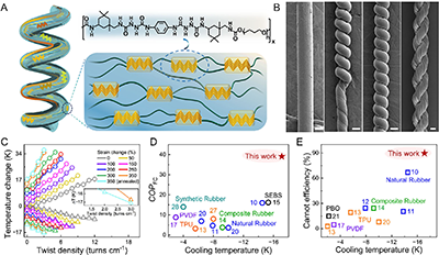 在现代社会,制冷技术消耗了全球约20%的电力资源。然而,传统基于蒸汽压缩的制冷系统不仅能效提升遭遇瓶颈,其使用的气态制冷剂往往具有强烈的温室效应。寻找高效、环保的固态制冷技术已成为全球科研领域的前沿课题。近年来,扭热制冷(Twistocaloric cooling)作为一种新兴的固态制冷方式,因其利用聚合物纤维在扭转/拉伸过程中的熵变产生制冷效应,具有极高的能量转换潜力,引起了广泛关注。然而,现有的聚合物制冷材料普遍面临一个棘手的问题:若要获得大的制冷温降,通常需要极大的形变量,这会导致高分子链滑移,从而缩短材料的使用寿命;而过度的交联虽然能提升稳定性,却会显著抑制材料的熵变,牺牲制冷效果。