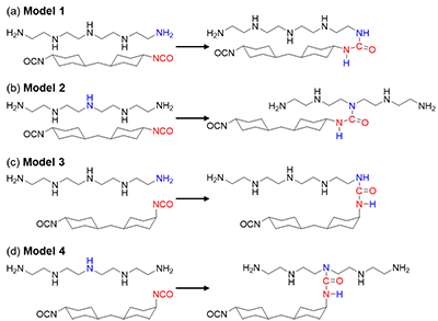 Figure 2. Schematic of the reactant and product for the direct proton transfer reaction between TEPA and HMDI investigated. (a) Primary amine of TEPA with trans-trans-HMDI (Model 1), (b) Secondary amine of TEPA with trans-trans-HMDI (Model 2), (c) Primary amine of TEPA with cis-trans-HMDI (Model 3), and (d) Secondary amine with cis-trans-HMDI (Model 4).