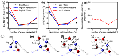 Figure 4. Influence of the number of water catalysts and counterpoise (CP) correction on ?G. (a) ?G for the reaction between TEPA (secondary amine) and HMDI (trans-trans-HMDI) without CP corrections. (b) ?G with CP. (c) Energy differences between results without and with CP correction. (d-g) Transition state structures for the four investigated cases in the gas phase.