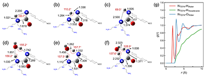 Figure 5. Hydrogen bond structures and solvation analysis for the TEPA-HMDI reaction. (a)-(c) Optimized geometries of the reactant, transition state, and product for direct proton transfer. (d)-(f) Optimized geometries of the reactant, transition state, , and product for single water molecule assisted proton transfer. (g) Radial distribution functions for atom pairs in the water/hexadecane solvated systems.
