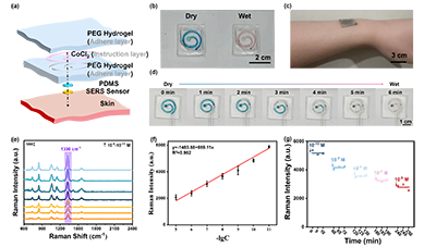 在实现纳米尺度信号增强的基础上,研究团队进一步将该高性能SERS结构与人体界面工程相结合,构建出从纳米结构到可穿戴系统的跨尺度集成平台。具体而言,具有强拉曼增强能力的超晶格三明治纳米结构被嵌入柔性基底中,并与皮肤自粘附PEG水凝胶构成仿生“人工皮肤”,使器件能够与人体皮肤表面实现稳定共形贴合。同时,通过在水凝胶内部引入微流体通道,实现对汗液的自动采集、导流与富集,从而将人体产生的生理信号高效传输至纳米传感界面进行检测。通过这种从纳米光学结构、微流体管理到柔性人体界面的系统级整合,器件不仅保持了高灵敏度和信号稳定性,还具备良好的佩戴舒适性与实际应用潜力,为可穿戴实时健康监测提供了一种新的技术路径。