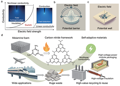 随着功率电子器件向高功率密度、高集成度方向快速发展,聚合物封装绝缘材料在长期电热耦合运行中容易发生电荷注入与积聚,进而诱发局部电场畸变,威胁器件绝缘可靠性。自适应介电材料因具备低场绝缘、高场导通的非线性响应特征,被认为是缓解空间电荷积累与电场畸变的重要候选。然而,现有非线性电导材料大多依赖半导体颗粒接触界面和肖特基势垒网络实现导电切换,其性能受颗粒接触状态、晶界结构和界面缺陷影响,长期面临低渗流阈值与性能可设计性难以兼顾的问题。