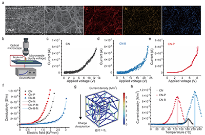 图2 连续g-C3N4骨架的结构特征与非线性导电行为。结果表明,g-C3N4泡沫具有三维连通骨架结构;通过 B、P掺杂可有效调控材料的导电开启行为,使复合材料在低填充条件下仍保持显著的非线性导电特性。