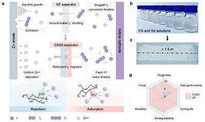 本研究利用带相反电荷的典型生物基高分子(即壳聚糖CS和海藻酸钠SA),通过简单的逐层溶液流延法制备了生物基高分子Janus隔膜(CSSA)。在锌负极侧,SA中丰富的羧基(-COO-)与Zn2+强配位以调控沉积/扩散行为,同时静电排斥多碘化物,抑制锌金属腐蚀;在碘正极侧,CS中的氨基(-NH3+)化学锚定多碘化物,并在电极界面处加速其氧化还原转化。基于CSSA隔膜的锌碘全电池在5 A g-1下循环超20,000次,容量衰减率低至每循环0.01‰。此外,通过两步流延法可以极低的成本实现规模化制备,展现出良好的大规模应用潜力。同时,该策略还具有良好的普适性,可扩展至多种天然带电生物大分子,为构筑兼具快速动力学和长寿命的水系锌电池提供了可规模化新途径。本研究为设计可持续生物聚合物隔膜、实现无穿梭效应及长循环水系锌碘电池提供了全新思路(图1)。