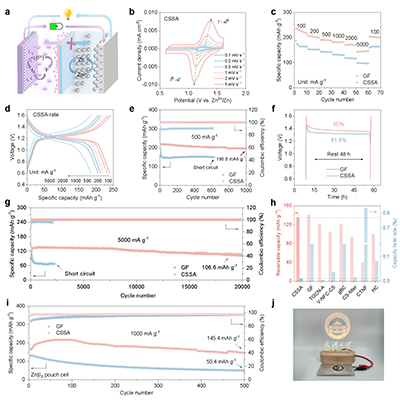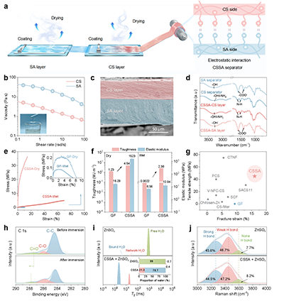 作者首先通过扫描电子显微镜和红外光谱证实了CSSA隔膜Janus结构的成功构筑。X射线光电子能谱分析进一步验证了Zn2+与-COO-及-NH3+基团之间的配位作用。该隔膜展现出优异的机械性能,湿态下的韧性达2.38 MJ m-3,远高于玻璃纤维隔膜;且经超过10,000次折叠后,其Janus结构依然保持完整。低场核磁共振与拉曼光谱分析表明,CSSA隔膜通过极性基团与水分子构建强氢键网络,有效调控水分子的存在状态,将自由水比例由99%降至近0%,从而显著抑制了水分子的活性,减少了副反应的发生,并提升了电池的稳定性(图2)。