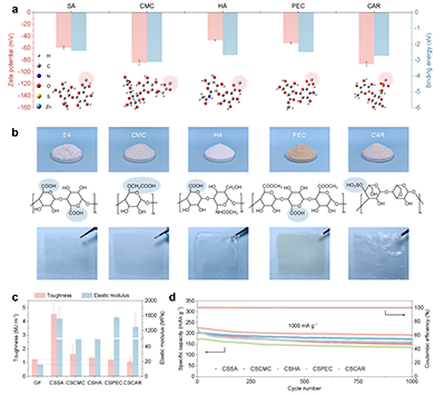 最后,作者进一步验证了该Janus隔膜策略的普适性。将SA替换为其他带负电的生物大分子(羧甲基纤维素、透明质酸、卡拉胶、果胶)后,所制备的Janus隔膜同样能通过负电性表面配位Zn2+、静电排斥多碘离子,并与CS层构筑稳定双层结构。理论计算表明,以上生物基聚合物与Zn2+的结合能均显著高于Zn2+-H2O,证实了其促进去溶剂化的能力。所制备的Janus隔膜均展现出优异的韧性和弹性模量,在1000 mA g?1电流密度下放电容量均超过167 mAh g-1、容量保持率高于75%,证明了该设计策略的普适性(图6)。
