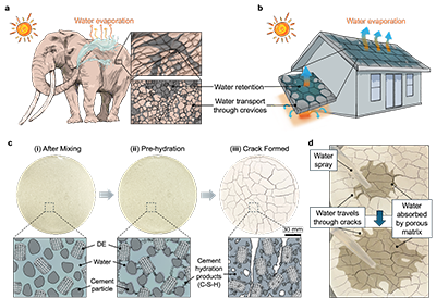 近日,美国宾夕法尼亚大学(University of Pennsylvania)杨澍(Shu Yang)教授团队提出了一种受大象皮肤启发的多孔裂纹水泥材料,通过“可编程裂纹网络”实现水分的高效捕获、定向传输与持续蒸发,从而显著提升被动蒸发冷却性能。