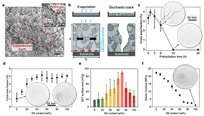 在材料设计方面,研究采用硅藻土(Diatomaceous Earth, DE)与水泥构建复合体系。硅藻土具有天然的微纳孔结构和亲水表面,能够实现超快速水分吸收并显著提升材料的储水能力,而水泥基体则提供必要的力学支撑,使材料具备实际工程应用的稳定性。如图2, 3所示,在制备过程中,材料首先经历预水化阶段形成初始结构,随后在干燥过程中,由于收缩与基底约束之间的竞争产生裂纹。这一过程可以通过力学模型描述:当干燥收缩诱导的拉应力超过材料断裂强度时,裂纹开始形成,并呈现出与材料厚度及界面摩擦相关的特征尺度。