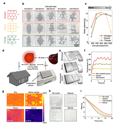为了解决上述问题,研究团队从自然界中获得灵感。如图2所示,大象皮肤表面具有复杂且高度互连的裂纹网络结构,这些裂纹不仅能够快速捕获水分,还可以通过毛细作用引导水在表面横向甚至在倾斜表面上扩散,从而延长水分停留时间并增强蒸发散热能力。受此启发,研究团队提出将“裂纹”从传统意义上的结构缺陷,转变为一种可设计、可调控的功能性输运网络。
