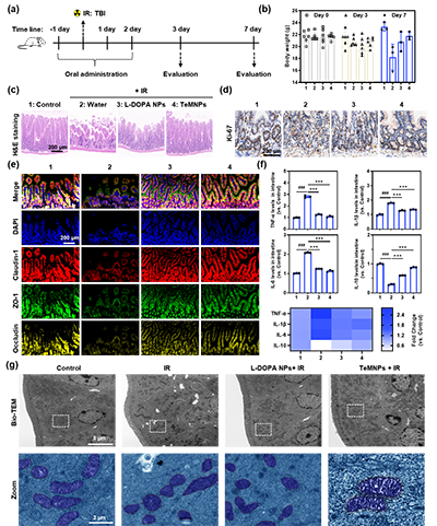 图3. Therapeutic effects on radiation-induced intestinal injury in mice. (a) Schematic illustration of therapeutic experiments with different groups in radiation-induced intestinal injury models. (b) Mice weight was measured after the indicated treatment. (c) Representative H&E staining images of intestinal tissue in each group at 7 days. (d) The proliferation-related Ki-67 was marked to label proliferative active cells. (e) Immunofluorescence images of claudin-1, ZO-1 and occluding in the intestinal tract. (f) Intestinal tissue inflammation levels measured by ELISA kits. (g) Bio-TEM images of mouse intestine with various treatments at 7 days. n = 6 mice per group.
