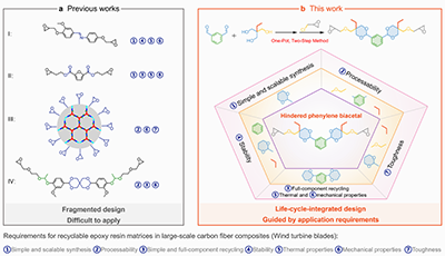 近年来,基于动态共价化学的可循环热固性树脂研究取得了长足进展,为解决热固性材料末端回收难题提供了核心思路。但面向风电等高端工业规模化应用场景时,现有研究仍难以同时兼顾材料的服役稳定性、加工适配性、规模化制备能力与末端可回收性,主要面临三大核心技术挑战:一是为实现温和降解引入高活性动态键,导致材料湿热稳定性、耐溶剂性大幅下降,无法满足长期服役要求;二是为提升力学性能构建高交联刚性网络,导致树脂粘度过高、加工窗口极窄,无法适配大型复合材料工业成型工艺;三是单体合成路线复杂、纯化步骤繁琐,难以规模化制备,仅能停留在实验室基础研究阶段,严重制约了其实际应用。
