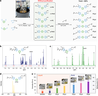 以大宗化工原料一步合成,实验室条件下单批次合成可稳定放大至200g 级,无需柱色谱纯化,具备工业化放大的技术潜力,可满足工业量产的核心基础要求。通过分子工程设计,采用间位取代、引入乙基侧链调控分子结构,得到的环氧单体在室温下为低粘度液体,其粘度与商用双酚A型环氧树脂(DGEBA)相当,满足真空辅助树脂灌注成型(VARI)等工业加工工艺对树脂流动性的要求(图2 )。