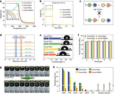 溶剂稳定性:在服役条件下,PEp网络在各种极性与非极性溶剂乃至酸、碱、盐水中均不溶解,保持结构完整。其适度的溶胀特性,可在服役阶段保持结构稳定,同时在回收阶段促进酸催化剂扩散,为高效降解提供了有利条件(图5h)。