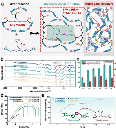 EPV-V2NBN的交联网络结构与传统EP网络有显著不同。由于V2NBN的分子量(460.36 g/mol)远高于Gte(260.28 g/mol),以及反应计量中1 mol Gte与1.5 mol V2NBN反应,V2NBN构成网络中的主要主链结构,因此Gte主要作为传统交联剂发挥作用。此外,EPV-V2NBN具有高刚性基团含量主链,当酚羟基和环氧基团以1:1摩尔比反应时,交联网络中的柔性Gte链难以承受施加的应力。因此,尽管刚性很高,材料在外部应力下仍表现出脆性断裂。作者巧妙提高了参与交联的Gte比例。过量的Gte与初级交联过程中产生的羟基反应,在网络中形成“柔性桥”(Over reaction)。这些桥梁富含醚键Gte链的柔韧性,在应力下可有效耗散能量,从而增强vitrimer的机械性能(图2)。