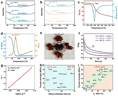 Vitrimer具有2.65 GPa 高储能模量,120 ℃下实现仅 8.7 s 的超快应力松弛,拓扑冻结温度低至–11.2℃,热稳定性优异,平衡高强环氧高刚性、难再加工的矛盾,直观展现出高强、高动态、易加工的突出优势(图3)。