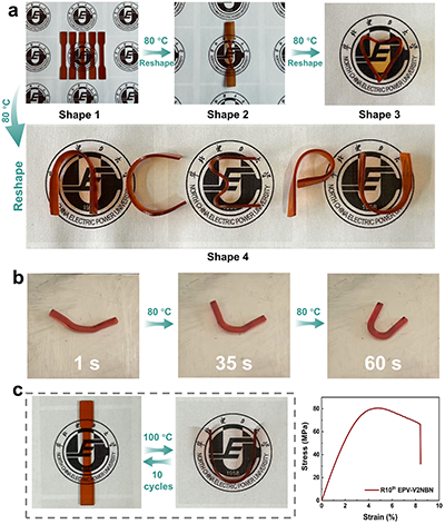 Vitrimer在80 ℃即可实现无模具自由塑形与快速形状回复,可轻松变换为螺旋、心形、字母等多种造型,加热后能自动复原;经 10 次反复热致形变循环后,材料拉伸强度仍保持在80 MPa 以上,有效解决了传统高强EP形状记忆性能弱、形变后强度大幅衰减的难题,兼具出色形状记忆功能与循环力学稳定性(图4)。