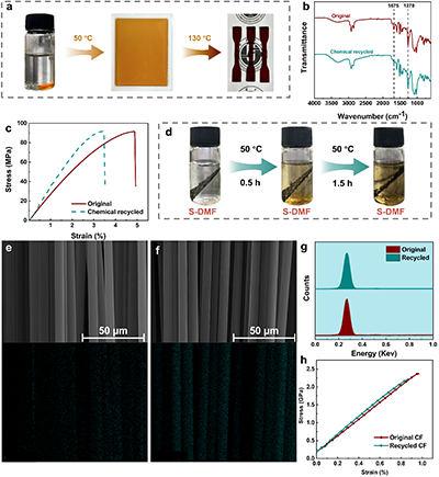 在 50 ℃ HCl /DMF(H2O)溶液中可完全降解,降解产物无需纯化直接再聚合,树脂拉伸强度 100% 保留;碳纤维复合材料(CFRPs)中树脂可快速温和剥离,回收后CF结构完整,表面无树脂残留、强度保留 94.1%,实现高附加值材料无损循环利用。