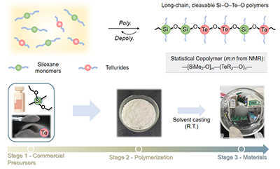 近期,清华大学许华平教授课题组报道了一种基于非碳杂原子主链设计的新型聚合物体系,构建出无需交联即可表现弹性、且可在室温下实现主链级解聚的硅基热塑性弹性体。作者通过液–液界面上硅烷水解聚合与碲醚氧化反应的耦合,发展了一步氧化–水解共聚策略,合成了含Si–O–Te–O连接单元的非碳杂原子主链聚合物PTeSiO(图1)。该体系将PDMS类硅氧烷骨架的柔顺性与Te–O键的氧化还原响应性结合,使材料同时具备热塑性弹性体行为和温和条件下的主链可解聚能力。在室温、维生素C水溶液等还原条件下,PTeSiO主链可发生断裂,实现高纯度Te单体和硅氧烷寡聚物的分离回收。