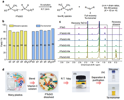 另外,通过在PDMS主链中引入具有可逆氧化还原响应的Te–O单元,材料可在温和还原条件下(室温水相、Vc溶液)实现主链级解聚与构筑单元回收(图4),得到高纯度碲单体和硅氧烷寡聚物,分离回收效率可达80%。由于特殊的解聚条件,该材料可从多组分塑料混合体系中实现选择性解聚与分离回收,使传统稳定的Si–O主链高分子无需交联、无需催化条件即可实现解构,赋予材料“可设计解聚、力学性质可调、可循环利用”的主链化学属性。该材料体系的生命周期均可室温下进行——即达到“室温聚合、室温使用、室温解聚”,推动非碳主链高分子研究从能合成进一步走向“能编辑、能解构、能循环”。
