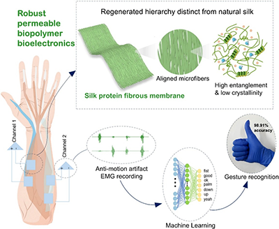图1. 基于超薄高韧丝素蛋白纤维膜表皮电极的双通道肌电手势识别