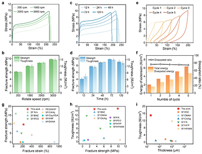 通过优化静电纺丝滚筒收集转速、吸湿驱动结晶时间,获得了取向微纤维、稀疏β-片层纳米晶交联的随机纠缠肽链网络结构的超薄超韧丝素蛋白纤维膜。在高转速(3000 rpm)下收集的具有高度取向微纳纤维,相应的力学性能显著提升。高湿处理12~72 h,β-片层含量增加,强度上升,延展性略有下降,继续延长至120 h则性能退化。与已报道的再生丝蛋白材料相比,SPFM在强度、延展性、韧性及厚度方面均具有显著优势。