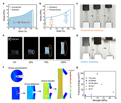 SPFM展现出优异的抗撕裂性能。在微纤维取向排列与肽链定向结构的协同作用下,材料在缺口处发生剪切变形,促使裂纹沿着拉伸方向发生偏转。偏振光观测与有限元模拟进一步表明,层级结构纤维膜能够通过纳米晶体与纠缠肽链的排列实现高效能量耗散,从而有效延缓裂纹扩展。得益于这一裂纹偏转与能量耗散的特殊机制,SPFM的断裂韧性高达98.18 kJ m-2,在所有报道的再生丝蛋白生物材料中处于最高水平。
