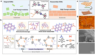 东华大学廖耀祖教授、张卫懿研究员团队报道一种由溶剂切换驱动的分子编织方法,以三(2-氨基乙基)胺(TREN)作为动态缝合单元,实现COF纳米片的可逆解组装与重构,构筑出高强度、低缺陷的COF气体分离膜。