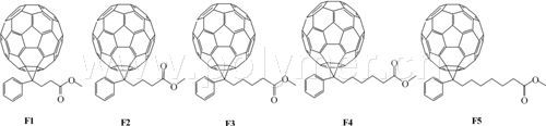另外,他们还合成了一系列不同烷基链长度的PCBM类C60衍生物F1~F5(分子结构见图3),其中F2就是PCBM。他们以这些C60衍生物为受体、P3HT为给体制备了光伏器件,发现取代基碳链长度对光伏性能有重要影响(能量转换效率分别是3.66%(F1), 3.52%(F2), 2.28%(F3), 3.59%(F4)和2.83%(F5)),F1(碳链长度比PCBM少一个C)和F4(碳链长度比PCBM多两个C)的光伏性能与PCBM相当或稍优(效率都超过3.5%),F3和F5(碳链长度比PCBM分别多一个和三个C)的光伏性能比PCBM明显变差。他们从碳链长度对电子迁移率和共混膜吸光系数的影响解释了这一现象。这一结果最近被Adv. Funct. Mater.接受发表。