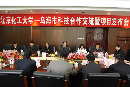 11月9日,北京化工大学——乌海市科技合作交流暨项目发布会在北京化工大学举行。乌海市代表团由市委常委、常务副市长冯玉臻带队,随行的有乌海市市长助理刘宏伟(北京化工大学挂职干部)、市经信委主任宋晓春、市科技局局长杜秀芬、市招商局局长贾庆东等相关部门领导以及企业负责人共计25人。北京化工大学校长王子镐、副校长王贵、科技处副处长张新生和刘淑金,机电学院副院长吴大鸣、信息学院副院长靳其兵以及部分学院教师共计19人参加了会议。