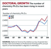 美国国家科学基金会和美国化学协会职业培训委员会跟踪了每年化学博士学位的授予数量。两个机构的数据略有差异,但均显示:从2006年开始,美国每年授予化学博士的数量呈增长趋势;从1999年至2005年间,每年大约有2050人获化学博士学位;从2006年至2009年,平均每年有2400人获化学博士学位。