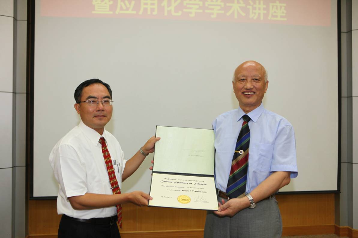 8月23日,台湾大学化工学院副院长、国科会高分子学门召集人陈文章教授应高分子物理与化学国家重点实验室邀请来到中国科学院长春应用化学研究所进行学术访问并做客“应用化学学术讲座”。长春应化所学术委员会主任景遐斌研究员向陈文章教授颁发了“中国科学院长春应用化学研究所客座教授”证书。