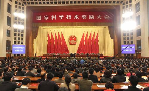 中共中央、国务院2月14日上午在北京隆重举行国家科学技术奖励大会。党和国家领导人胡锦涛、温家宝、李长春、李克强出席大会并为获奖代表颁奖。温家宝代表党中央、国务院在大会上讲话。李克强主持大会。