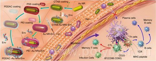 研究人员合成了十六烷基三甲基溴化铵(CTAB)、聚二烯丙基二甲基氯化铵(PDDAC)和聚乙烯亚胺(PEI)修饰的三种带正电荷的金纳米棒,研究了其对艾滋病DNA疫苗的潜在佐剂作用。体外细胞水平研究发现,三种金纳米棒对DNA具有不同的释放能力,从而使其具有截然不同的细胞转染能力。动物活体研究结果显示,只有当金纳米棒表面进行适当修饰后才能显示出良好的佐剂活性。除了CTAB-Au Nanorod,其他两种金纳米棒均能通过促进抗原呈递细胞的成熟发挥其佐剂作用。阳离子聚合物聚乙烯亚胺被认为是转染效率最高的聚合物基因载体之一,高分子量的PEI转染效率高,但细胞毒性很大。本工作将其组装于金纳米棒的表面,可大大提高其疫苗佐剂效应,且显著降低毒性。