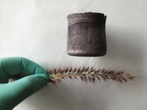 100立方厘米大小的“碳海绵”“踩”在狗尾巴草上,纤细的草须一点都没有被压弯