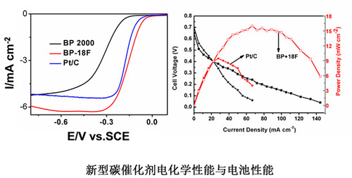 徐维林课题组通过向普通的碳黑中掺杂氟元素获得了一种简单廉价的氧还原碳催化剂,该碳催化剂在碱性环境中的活性、寿命、以及抗中毒稳定性方面均优于商业铂碳催化剂,氧还原起始电位达到30mV,高出商业铂碳催化剂的0mV。采用该催化剂组装的碱性甲醇燃料电池性能高出商业铂碳催化剂,是目前非金属氧还原催化剂的最高性能。课题组通过理论计算结合实验验证,揭示了催化剂性能与掺杂物种之间的电荷相互作用机理,成功获得了一种可替代商业铂碳催化剂的廉价非金属催化剂,是目前性价比最高的氧还原催化剂,相关技术已经申请专利。