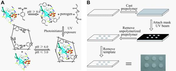 光刻硼亲和分子印迹法的原理(A)及步骤(B)