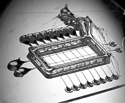 制造步骤:研究人员使用一台开源的RepRap打印机和定制软件,在一个模型内打印出一个糖丝网络,并用从玉米那提取出的化合物覆盖这些糖丝。接着,他们将包含有组织细胞的凝胶放入模型内。随后,他们将准备妥当的结构在水中清洗。一旦入水,糖溶解在水中,只留下组织中空空的管道。
