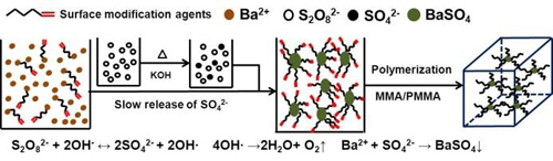 针对这一核心问题,宁波材料所生物医用高分子团队提出将表面改性和纳米粒子原位合成相结合的思想,通过采用双官能团小分子表面修饰剂,调控硫酸钡纳米粒子形貌,改善硫酸钡纳米粒子和高分子基质相容性,提高其和树脂基体的结合力。在此基础上,结合过硫酸根离子原位分解过程,实现表面改性硫酸钡粒子可控原位合成(图1,图2)。