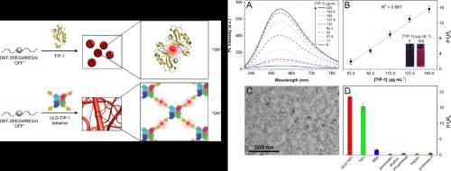 该研究使用具有自组装能力,并且与特定蛋白有相互作用的多肽序列上修饰环境响应型荧光分子,与蛋白相互结合后,形成共组装纳米结构,从而改变荧光分子周围的环境,使得原本不发光的分子发出强烈荧光,达到检测与可视化的目的。该研究成果对于新型荧光探针材料的研究与开发有重要意义,拓展了多肽自组装体系的应用领域,为多肽-蛋白质相互作用的特异性检测与可视化提供了新思路。