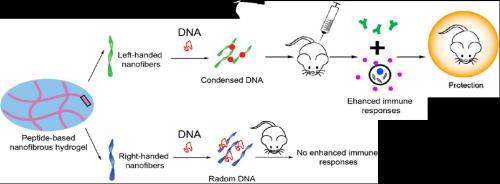 DNA疫苗用于HIV的预防与治疗。课题组在研究过程中发现左旋的多肽纳米纤维能够使包裹其中的DNA形成浓聚形态,在体内引起强烈的免疫反应从而达到预防与治疗效果;而右旋的纳米纤维无此效果。该研究成果是首例成功达到免疫效果的多肽自组装纤维纳米载体DNA疫苗,鉴于多肽纳米纤维具有良好的生物相容性和安全性,未来将能够用作各种药物以及疫苗的载体。