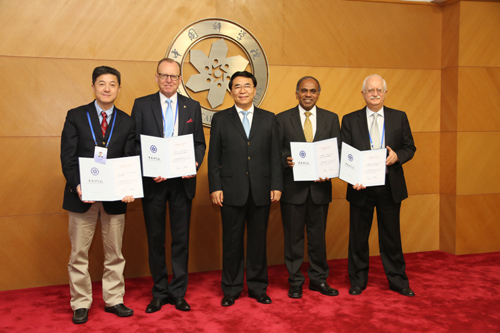 6月8日下午,中国科学院第十七次院士大会外籍院士证书颁发仪式暨学部工作座谈会在北京举行。中科院院长、中科院学部主席团执行主席白春礼出席颁证仪式,并向参加院士大会的美国卡内基梅隆大学教授Subra Suresh、法国高等师范学院教授Christian Amatore、丹麦奥胡斯大学教授Flemming Besenbacher、斯坦福大学教授张首晟等4位新当选外籍院士颁发证书。美国科学院院长Ralph Cicerone、瑞士科学院院长Thierry Courvoisier、印度国立科学院前院长Krishan Lal、国际科学院组织执委会主席Volker ter Meulen等6位外国科学院或国际科技组织领导,11位外籍院士,以及中科院学部主席团部分成员出席座谈会,会议由中科院副院长李静海主持。