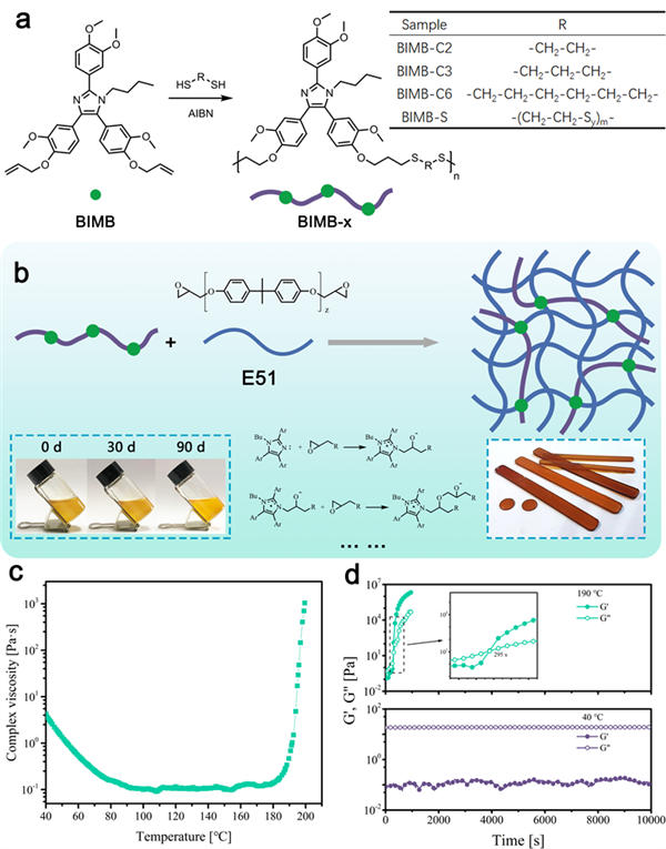 单组分环氧树脂由环氧树脂预聚物与潜伏型固化剂构成,具有储存稳定性良好,加工性能优秀的特点,但是目前围绕环氧树脂用生物基潜伏型固化剂的研究还较少。咪唑衍生物是应用较多的环氧树脂用潜伏型固化剂,利用生物质资源制备咪唑等含氮杂环类化合物一直是一大难题。近日,贵州大学材料与冶金学院谢海波教授课题组报道了一种以生物基化学品香草醛为起始原料合成生物基咪唑衍生物的策略(图1)。所得咪唑衍生物携带乙烯基,经巯烯点击反应可聚合获得生物基大分子潜伏型固化剂,其与商用环氧树脂E51混合获得的环氧树脂前驱体表现出优异的储存稳定性,且可在高温下快速固化形成生物基环氧树脂(图2)。树脂的玻璃化转变温度、热稳定性、交联密度等可通过改变生物基大分子潜伏型固化剂分子结构进行调控。此外,由于大分子固化剂携带柔性链,固化后可与环氧树脂基体形成半互穿结构,在不损害强度的同时有效增韧树脂材料。