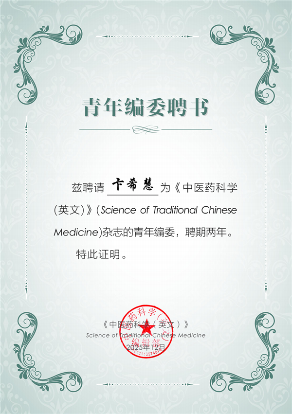 祝贺课题组卞希慧老师2025年被Science of Traditional Chinese Medicine聘为青年编委。