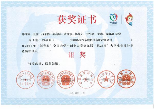 2014年“创青春”全国大学生创业大赛第九届“挑战杯”大学生创业计划竞赛铜奖