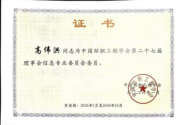 高伟洪同志为中国纺织工程学会第二十七届理事会信息专业委员会委员。